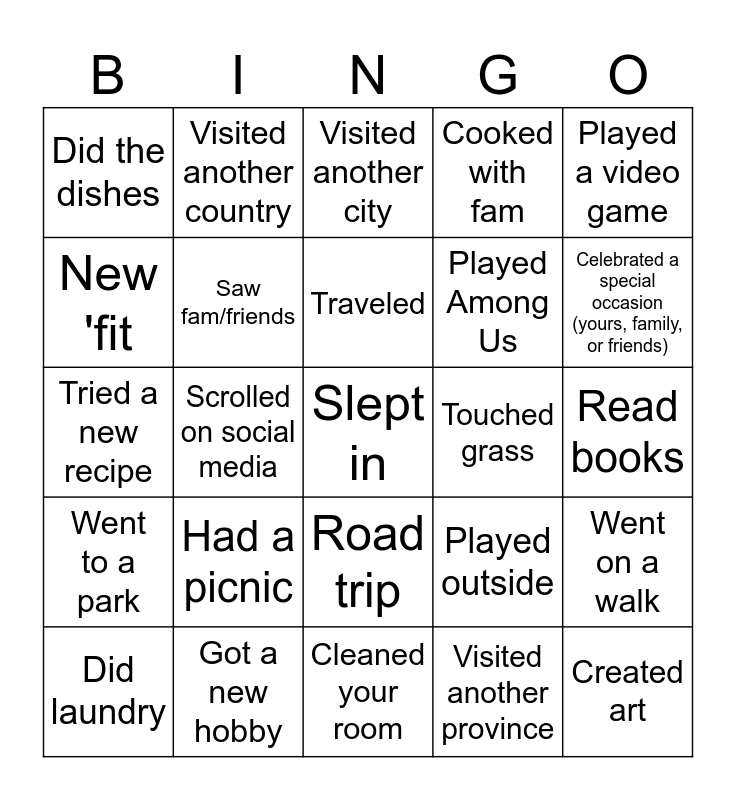 This bingo card has a free space and 31 words: Cleaned your room, Made a TikTok, Scrolled on social media, Ate a lot of food, Did the dishes, Visited another city, Saw fam/friends, Played outside, Touched grass, Visited another province, Read books, Created art, Played a board game, Went shopping, Celebrated a special occasion (yours, family, or friends), Got a haircut or nails done, Went on a walk, Had a picnic, Went to a park, Road trip, Played a video game, Beat a video game, Did laundry, Visited another country, Played Among Us, New 'fit, Cooked with fam, Tried a new recipe, Got a new hobby, Traveled and Had a picnic.