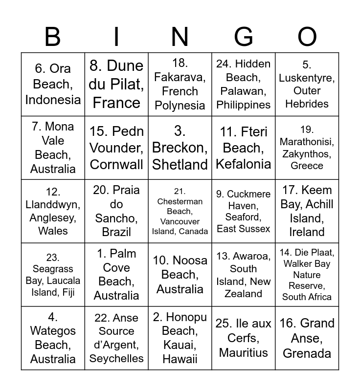 This bingo card has 25 words: 1. Palm Cove Beach, Australia, 2. Honopu Beach, Kauai, Hawaii, 3. Breckon, Shetland, 4. Wategos Beach, Australia, 5. Luskentyre, Outer Hebrides, 6. Ora Beach, Indonesia, 7. Mona Vale Beach, Australia, 8. Dune du Pilat, France, 9. Cuckmere Haven, Seaford, East Sussex, 10. Noosa Beach, Australia, 11. Fteri Beach, Kefalonia, 12. Llanddwyn, Anglesey, Wales, 13. Awaroa, South Island, New Zealand, 14. Die Plaat, Walker Bay Nature Reserve, South Africa, 15. Pedn Vounder, Cornwall, 16. Grand Anse, Grenada, 17. Keem Bay, Achill Island, Ireland, 18. Fakarava, French Polynesia, 19. Marathonisi, Zakynthos, Greece, 20. Praia do Sancho, Brazil, 21. Chesterman Beach, Vancouver Island, Canada, 22. Anse Source d’Argent, Seychelles, 23. Seagrass Bay, Laucala Island, Fiji, 24. Hidden Beach, Palawan, Philippines and 25. Ile aux Cerfs, Mauritius.