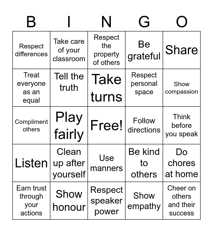 This bingo card has a free space and 24 words: Clean up after yourself, Show honour, Take turns, Earn trust through your actions, Share, Respect differences, Treat everyone as an equal, Take care of your classroom, Follow directions, Use manners, Respect personal space, Compliment others, Be kind to others, Do chores at home, Tell the truth, Show empathy, Think before you speak, Respect the property of others, Show compassion, Play fairly, Cheer on others and their success, Listen, Be grateful and Respect speaker power.