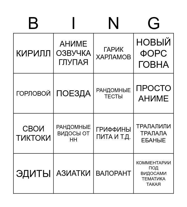 This bingo card has 16 words: АЗИАТКИ, ТРАЛАЛИЛИ ТРАЛАЛА ЕБАНЫЕ, ГАРИК ХАРЛАМОВ, КИРИЛЛ, СВОИ ТИКТОКИ, АНИМЕ ОЗВУЧКА ГЛУПАЯ, ГРИФФИНЫ ПИТА И Т.Д., ВАЛОРАНТ, ГОРЛОВОЙ, ПОЕЗДА, ЭДИТЫ, НОВЫЙ ФОРС ГОВНА, РАНДОМНЫЕ ВИДОСЫ ОТ НН, ПРОСТО АНИМЕ, РАНДОМНЫЕ ТЕСТЫ and КОММЕНТАРИИ ПОД ВИДОСАМИ ТЕМАТИКА ТАКАЯ.