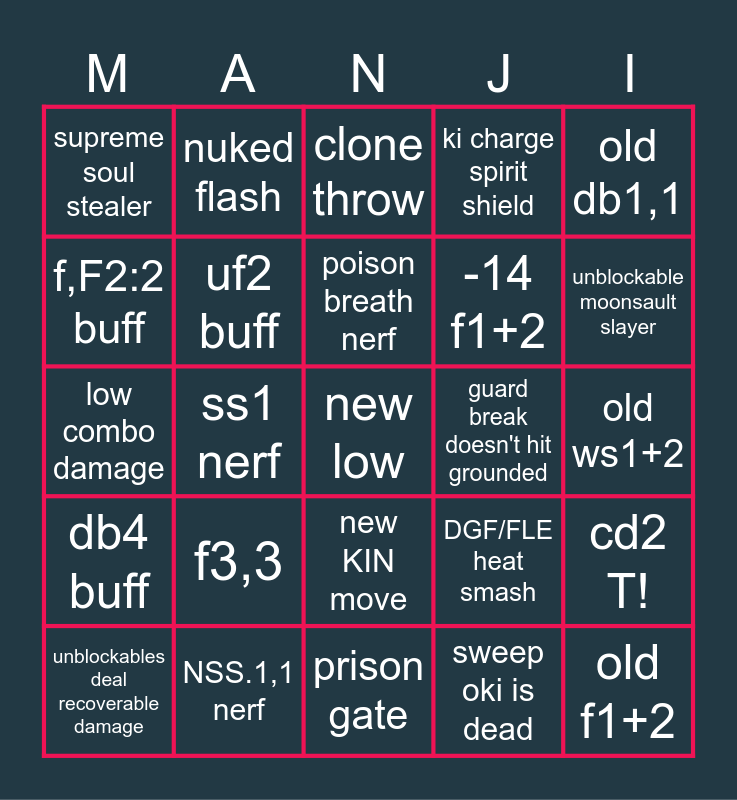 This bingo card has a free space and 24 words: f3,3, NSS.1,1 nerf, poison breath nerf, unblockables deal recoverable damage, old db1,1, supreme soul stealer, f,F2:2 buff, nuked flash, guard break doesn't hit grounded, new KIN move, -14 f1+2, low combo damage, DGF/FLE heat smash, cd2 T!, uf2 buff, sweep oki is dead, old ws1+2, clone throw, unblockable moonsault slayer, ss1 nerf, old f1+2, db4 buff, ki charge spirit shield and prison gate.