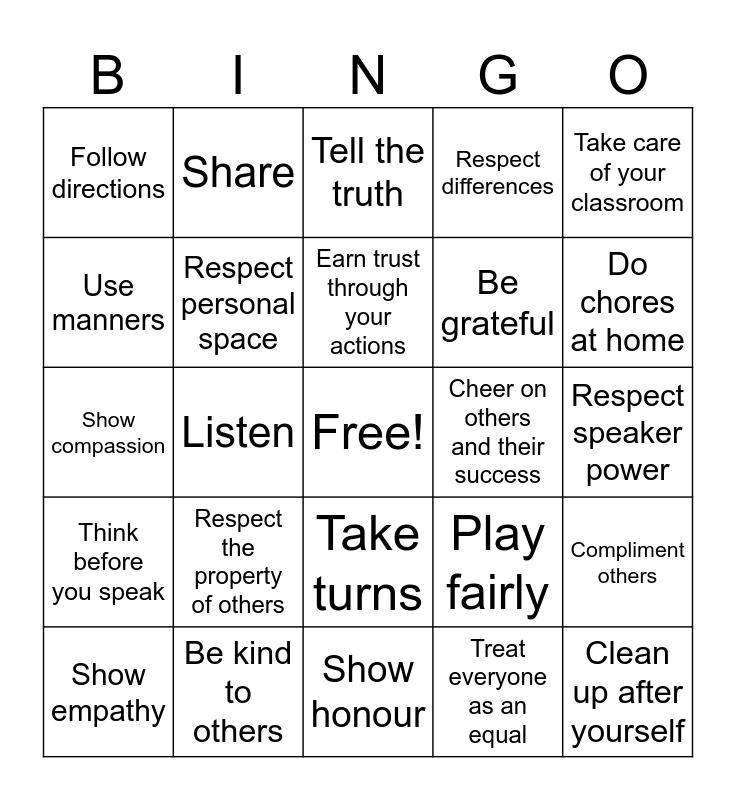 This bingo card has a free space and 24 words: Respect the property of others, Be kind to others, Earn trust through your actions, Show empathy, Take care of your classroom, Follow directions, Use manners, Share, Cheer on others and their success, Take turns, Be grateful, Show compassion, Play fairly, Compliment others, Respect personal space, Treat everyone as an equal, Respect speaker power, Tell the truth, Do chores at home, Listen, Clean up after yourself, Think before you speak, Respect differences and Show honour.
