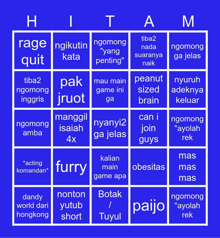 This bingo card has a free space and 24 words: furry, nonton yutub short, mau main game ini ga, dandy world dari hongkong, ngomong ga jelas, rage quit, tiba2 ngomong inggris, ngikutin kata, can i join guys, kalian main game apa, peanut sized brain, ngomong amba, obesitas, mas mas mas, pak jruot, paijo, ngomong "ayolah rek, ngomong "yang penting", nyuruh adeknya keluar, manggil isaiah 4x, ngomong "ayolah rek, *acting komandan*, tiba2 nada suaranya naik and Botak / Tuyul.