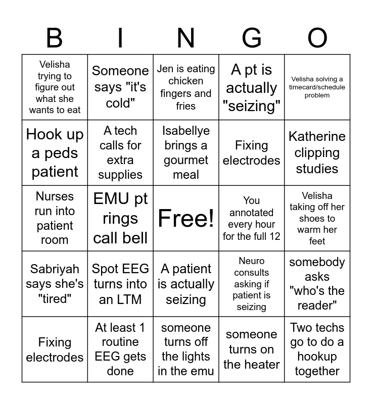 This bingo card has a free space and 24 words: Spot EEG turns into an LTM, At least 1 routine EEG gets done, Isabellye brings a gourmet meal, Fixing electrodes, Velisha solving a timecard/schedule problem, Velisha trying to figure out what she wants to eat, Hook up a peds patient, Someone says "it's cold", You annotated every hour for the full 12, A patient is actually seizing, Fixing electrodes, Nurses run into patient room, Neuro consults asking if patient is seizing, somebody asks "who's the reader", A tech calls for extra supplies, someone turns on the heater, Velisha taking off her shoes to warm her feet, Jen is eating chicken fingers and fries, Katherine clipping studies, EMU pt rings call bell, Two techs go to do a hookup together, Sabriyah says she's "tired", A pt is actually "seizing" and someone turns off the lights in the emu.