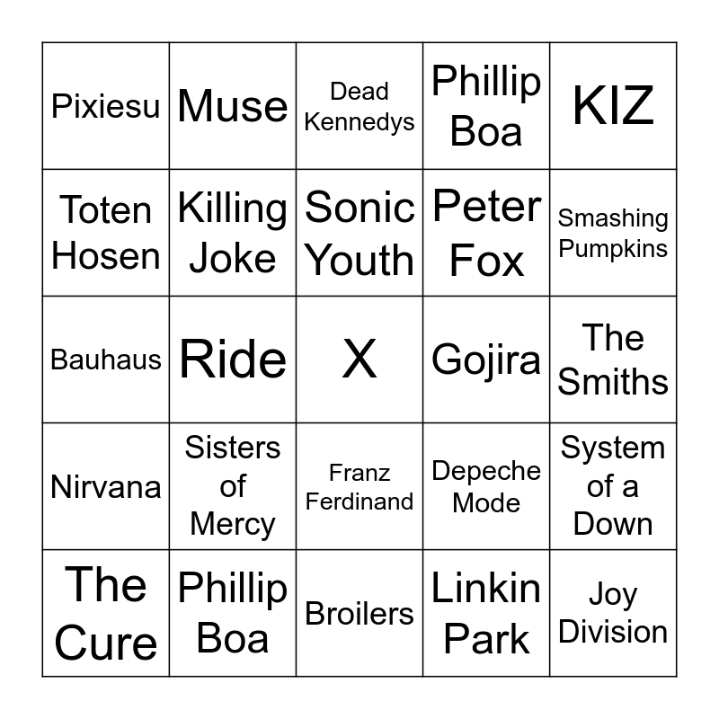 This bingo card has a free space and 24 words: Sisters of Mercy, Phillip Boa, Sonic Youth, The Cure, KIZ, Pixiesu, Toten Hosen, Muse, Gojira, Franz Ferdinand, Peter Fox, Bauhaus, Depeche Mode, System of a Down, Killing Joke, Linkin Park, The Smiths, Dead Kennedys, Smashing Pumpkins, Ride, Joy Division, Nirvana, Phillip Boa and Broilers.
