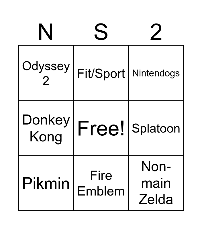 This bingo card has a free space and 8 words: Splatoon, Nintendogs, Fit/Sport, Pikmin, Odyssey 2, Non-main Zelda, Donkey Kong and Fire Emblem.