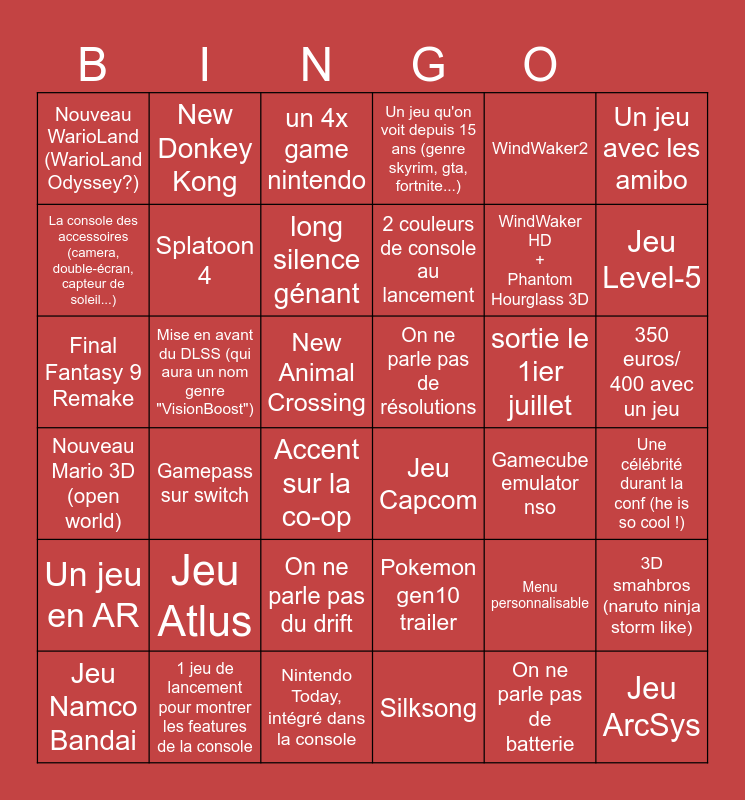 This bingo card has 36 words: Nouveau Mario 3D (open world), Gamepass sur switch, Nintendo Today, intégré dans la console, 2 couleurs de console au lancement, sortie le 1ier juillet, 350 euros/ 400 avec un jeu, Nouveau WarioLand (WarioLand Odyssey?), 1 jeu de lancement pour montrer les features de la console, un 4x game nintendo, Pokemon gen10 trailer, WindWaker HD + Phantom Hourglass 3D, Un jeu avec les amibo, Un jeu en AR, Mise en avant du DLSS (qui aura un nom genre "VisionBoost"), long silence génant, Un jeu qu'on voit depuis 15 ans (genre skyrim, gta, fortnite...), Menu personnalisable, Une célébrité durant la conf (he is so cool !), La console des accessoires (camera, double-écran, capteur de soleil...), Splatoon 4, Accent sur la co-op, Jeu Capcom, Gamecube emulator nso, 3D smahbros (naruto ninja storm like), Final Fantasy 9 Remake, New Donkey Kong, New Animal Crossing, Silksong, WindWaker2, Jeu Level-5, Jeu Namco Bandai, Jeu Atlus, On ne parle pas du drift, On ne parle pas de résolutions, On ne parle pas de batterie and Jeu ArcSys.