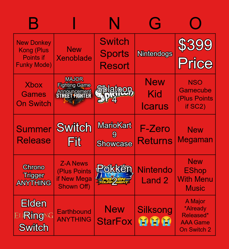 This bingo card has 6 images, a free space and 39 words: New Smash, New Animal Crossing Announced, Punch-Out Returns, MAJOR Fighting Game Announcement, Elden Ring Switch, Pokkén 2, Splatoon 4, New 3D Mario, $399 Price, Chrono Trigger ANYTHING, Switch Fit, Nintendogs, A Major *Already Released* AAA Game On Switch 2, New Megaman, F-Zero Returns, Z-A News (Plus Points if New Mega Shown Off), Fuckin' Metroid Whatever, New Donkey Kong (Plus Points if Funky Mode), Mostly Showing Off Hardware Rather Than Games, Nintendo Land 2, Xbox Games On Switch, New StarFox, New Kid Icarus, NSO Gamecube (Plus Points if SC2), ARMS Sequel (Plus Points if Called LEGS), Old Zelda Remake, Joycon Mouse Features, Luigi's Mansion 4, New Nintendo IP, New Xenoblade, JRPG Anything, Farming Games (Or Other Boring Indies), Switch Sports Resort, Earthbound ANYTHING, Silksong 😭😭😭, Golden Sun Returns NINTENDO PLEASEEE, New EShop With Menu Music, Summer Release and Something Atlus.