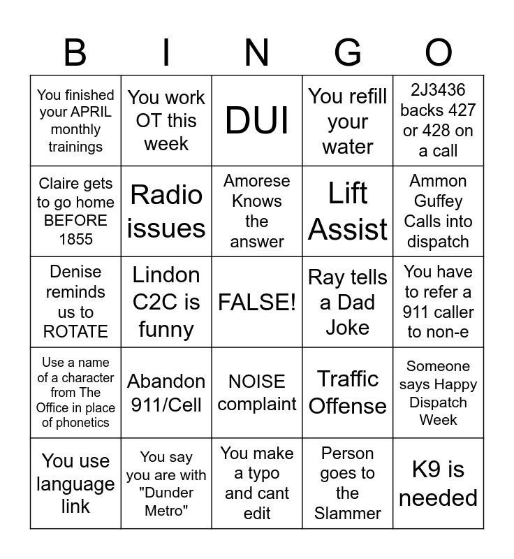 This bingo card has a free space and 29 words: You use language link, Someone in the room Complains, Lindon C2C is funny, You talk to an Alarm Co., You finished your APRIL monthly trainings, DUI, Radio issues, Abandon 911/Cell, Ray tells a Dad Joke, You say you are with "Dunder Metro", You have to refer a 911 caller to non-e, K9 is needed, You make a typo and cant edit, Person goes to the Slammer, Ammon Guffey Calls into dispatch, Hannah gets MAD, NOISE complaint, Use a name of a character from The Office in place of phonetics, 2J3436 backs 427 or 428 on a call, Denise reminds us to ROTATE, Traffic Offense, Spillman is slowww, Lift Assist, Claire gets to go home BEFORE 1855, You refill your water, You work OT this week, Someone says Happy Dispatch Week, Amorese Knows the answer and Someone is calling from OUTSIDE of utah county.