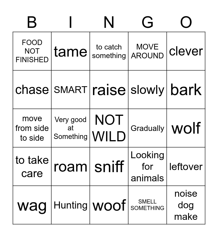 This bingo card has a free space and 24 words: roam, Hunting, raise, wag, clever, FOOD NOT FINISHED, chase, tame, Gradually, sniff, slowly, move from side to side, Looking for animals, leftover, SMART, SMELL SOMETHING, wolf, to catch something, bark, Very good at Something, noise dog make, to take care, MOVE AROUND and woof.