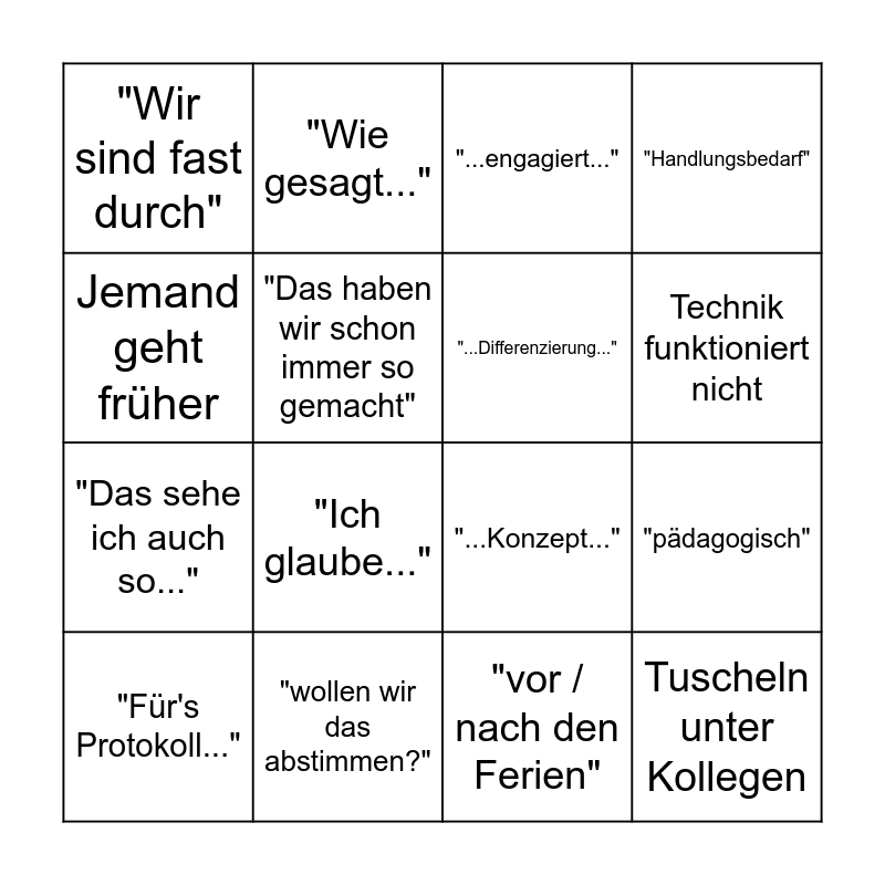 This bingo card has 23 words: Tuscheln unter Kollegen, Jemand schaut aufs Handy, Technik funktioniert nicht, Jemand kommt zu spät, Jemand geht früher, "Wir sind fast durch", "Das haben wir schon immer so gemacht", "Wie gesagt...", "Für's Protokoll...", "Das können wir doch einfach mal ausprobieren.", "Ich glaube...", "Das sehe ich auch so...", "Ich schließe mich meinem Vorredner an", "...zielführend...", "wollen wir das abstimmen?", "Ich sag's mal so...", "...engagiert...", "...Konzept...", "...Differenzierung...", "pädagogisch", "Handlungsbedarf", "vor / nach den Ferien" and "Ich würde sagen...".