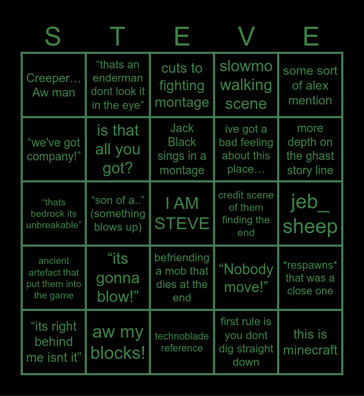 This bingo card has a free space and 24 words: “its right behind me isnt it”, “its gonna blow!”, Jack Black sings in a montage, first rule is you dont dig straight down, some sort of alex mention, Creeper… Aw man, “thats an enderman dont look it in the eye”, cuts to fighting montage, credit scene of them finding the end, jeb_ sheep, “thats bedrock its unbreakable”, is that all you got?, “Nobody move!”, *respawns* that was a close one, “we've got company!”, aw my blocks!, technoblade reference, slowmo walking scene, more depth on the ghast story line, ancient artefact that put them into the game, “son of a..” (something blows up), befriending a mob that dies at the end, ive got a bad feeling about this place… and this is minecraft.