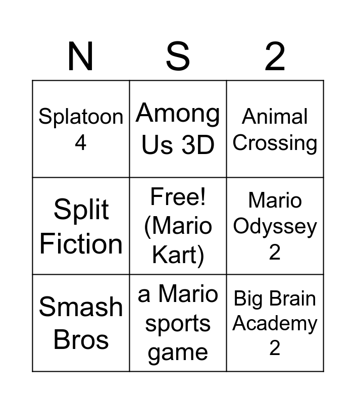 This bingo card has a free space and 8 words: Mario Odyssey 2, Animal Crossing, Among Us 3D, Smash Bros, Splatoon 4, Big Brain Academy 2, Split Fiction and a Mario sports game.