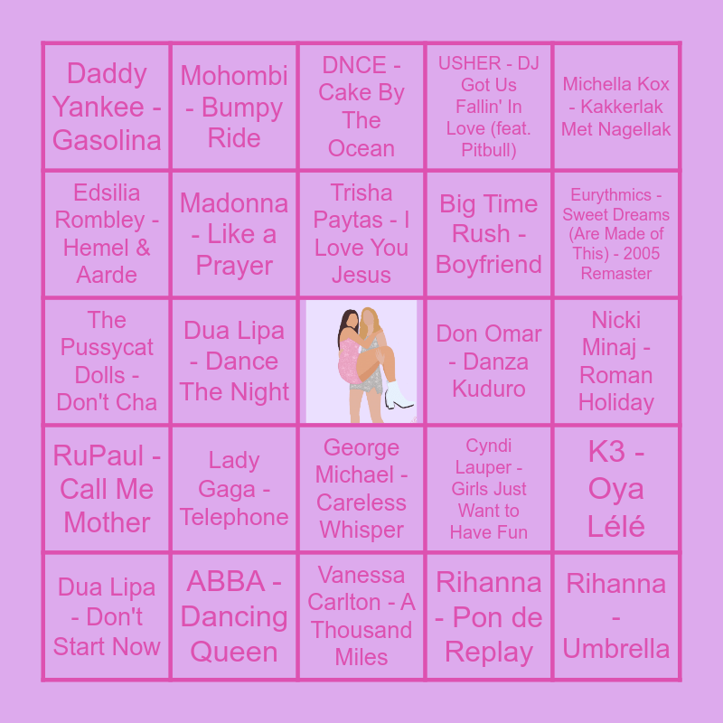 This bingo card has a free space and 63 words: Käärijä & Joost - TRAFIK!, Britney Spears - Break the Ice, Boef - Habiba, K3 - Oya Lélé, Käärijä - Cha Cha Cha, Flo Rida - Low (feat. T-Pain), Mohombi - Bumpy Ride, Trisha Paytas - Freaky, Trisha Paytas - I Love You Jesus, Mula B - Kenia, George Michael - Careless Whisper, Nicki Minaj - Anaconda, Nicki Minaj - Roman Holiday, Michella Kox - Kakkerlak Met Nagellak, Jason Derulo - Whatcha Say, Edsilia Rombley - Hemel & Aarde, Dua Lipa - Dance The Night, Daddy Yankee - Gasolina, Joost - Europapa, Big Time Rush - Boyfriend, Lady Gaga - Telephone, RuPaul - Call Me Mother, USHER - DJ Got Us Fallin' In Love (feat. Pitbull), Shakira - Hips Don't Lie (feat. Wyclef Jean), Kesha - TiK ToK, USHER - Yeah! (feat. Lil Jon & Ludacris), Spongebob Squarepants - Stadium Rave, Miley Cyrus - Party In The U.S.A., Nicki Minaj - Super Bass, Britney Spears - Toxic, Ariana Grande - 7 rings, Baauer - Harlem Shake, Shakira - Can't Remember to Forget You (feat. Rihanna), Lady Gaga - Born This Way, Eurythmics - Sweet Dreams (Are Made of This) - 2005 Remaster, Dua Lipa - Don't Start Now, Katy Perry - I Kissed A Girl, Rihanna - Pon de Replay, Ricky Martin - Livin' la Vida Loca, Madonna - Like a Prayer, The Pussycat Dolls - Don't Cha, Don Omar - Danza Kuduro, Sabrina Carpenter - Espresso, Spice Girls - Wannabe, Rihanna - Umbrella, ABBA - Dancing Queen, Dua Lipa - New Rules, Cyndi Lauper - Girls Just Want to Have Fun, John Travolta - You're The One That I Want - From “Grease”, Pitbull - Time of Our Lives, Harry Styles - Watermelon Sugar, Vanessa Carlton - A Thousand Miles, Smash Mouth - All Star, Nicki Minaj - Starships, Justin Bieber - Baby, DNCE - Cake By The Ocean, Broederliefde - Alaka, Ali B - Rampeneren, Goldband - Noodgeval, Ronnie Flex - Zusje, De Jeugd Van Tegenwoordig - Sterrenstof, SBMG - LIT and Yung Felix - Loco.