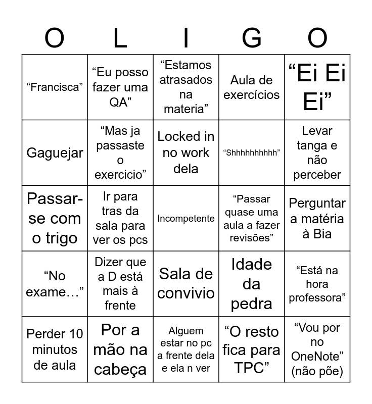 This bingo card has a free space and 30 words: Por a mão na cabeça, “Nunca nos meus 30 anos”, Ir para tras da sala para ver os pcs, Primária, “Francisca”, “Estamos atrasados na materia”, “Mas ja passaste o exercicio”, Sala de convivio, “Passar quase uma aula a fazer revisões”, Alguem estar no pc a frente dela e ela n ver, Perguntar a matéria à Bia, “Vou por no OneNote” (não põe), “O resto fica para TPC”, Esquece-se do TPC, Levar tanga e não perceber, “Não estou a entender”, Idade da pedra, “No exame…”, Dizer que a D está mais à frente, “Ei Ei Ei”, Passar-se com o trigo, “Calmaa”, “Eu posso fazer uma QA”, “Shhhhhhhhhh”, Gaguejar, Aula de exercícios, “Está na hora professora”, Perder 10 minutos de aula, Locked in no work dela and Reclamar das medias/notas.