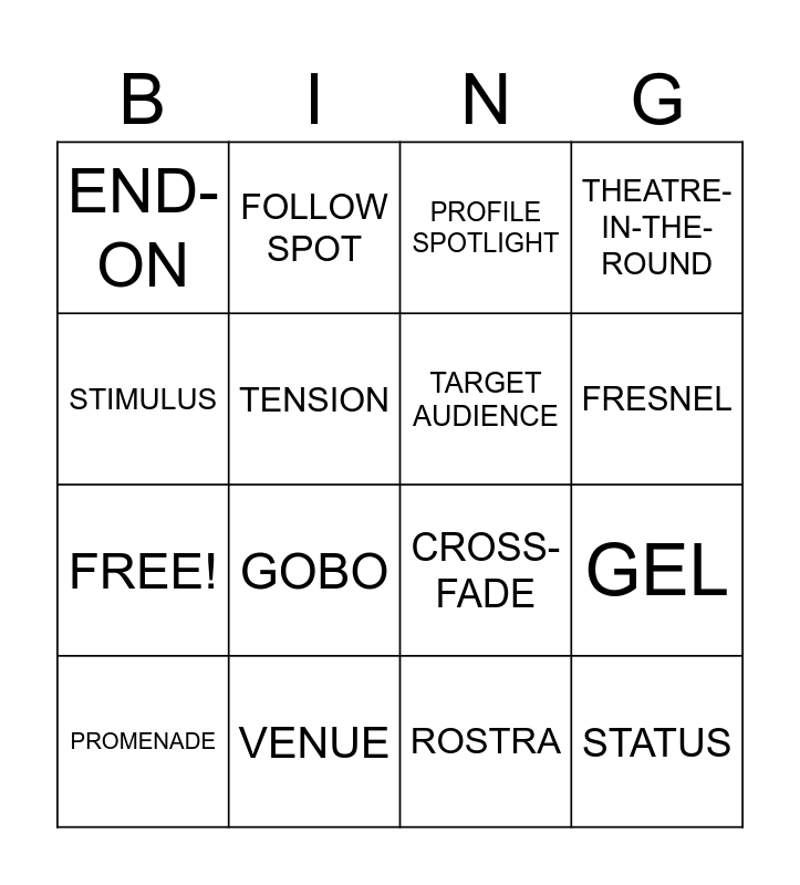 This bingo card has 20 words: PROMENADE, THRUST, PROFILE SPOTLIGHT, GEL, AVENUE, GOBO, ROSTRA, THEATRE-IN-THE-ROUND, FREE!, FOLLOW SPOT, CROSS-FADE, FRESNEL, END-ON, VENUE, TARGET AUDIENCE, PURPOSE, STIMULUS, TENSION, STRUCTURE and STATUS.