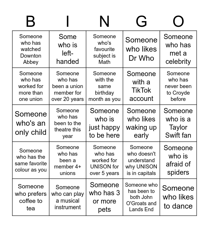 This bingo card has 25 words: Someone who has been a member 4+ unions, Someone who has 3 or more pets, Someone with the same birthday month as you, Someone who prefers coffee to tea, Someone who has met a celebrity, Someone who has watched Downton Abbey, Someone who has worked for more than one union, Some who is left-handed, Someone who likes waking up early, Someone who has worked for UNISON for over 5 years, Someone with a TikTok account, Someone who's an only child, Someone who doesn't understand why UNISON is in capitals, Someone who is afraid of spiders, Someone who has been a union member for over 20 years, Someone who likes to dance, Someone who is a Taylor Swift fan, Someone who's favourite subject is Math, Someone who has never been to Croyde before, Someone who has been to the theatre this year, Someone who is just happy to be here, Someone who can play a musical instrument, Someone who has the same favorite colour as you, Someone who likes Dr Who and Someone who has been to both John O'Groats and Lands End.