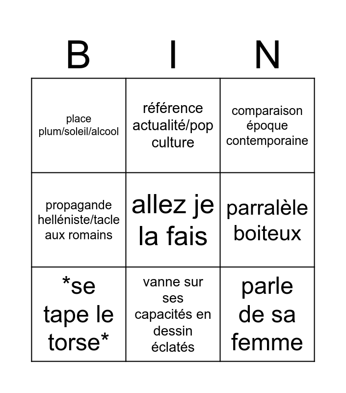This bingo card has a free space and 8 words: parralèle boiteux, comparaison époque contemporaine, référence actualité/pop culture, *se tape le torse*, place plum/soleil/alcool, parle de sa femme, propagande helléniste/tacle aux romains and vanne sur ses capacités en dessin éclatés.