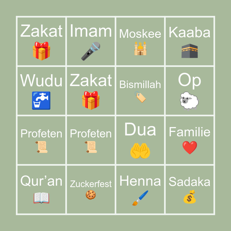 ⚠ This card has duplicate items: Qurβan π (2), Eid Mubarak β¨ (2), Iftar π² (2), Imam π€ (2), Salam π (2), Zakatπ (3), Ramadan π (2), Bismillah π·οΈ (2), Kaaba π (2), Henna ποΈ (2), Dua π€² (3), Takbir π’ (2), Halal π (3), Wudu π° (2), Familie β€οΈ (2), Allah βοΈ (2), Profeten π (2), Vasten βοΈ (2)