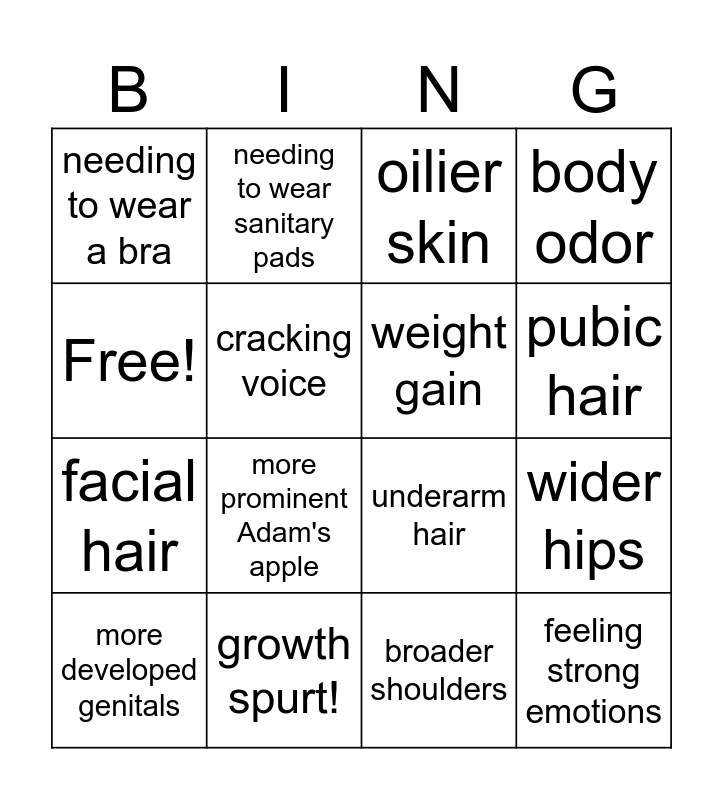 This bingo card has 16 words: growth spurt!, wider hips, oilier skin, needing to wear a bra, facial hair, needing to wear sanitary pads, underarm hair, broader shoulders, Free!, cracking voice, more developed genitals, body odor, more prominent Adam's apple, pubic hair, weight gain and feeling strong emotions.