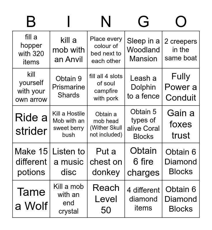 This bingo card has 26 words: Put a chest on donkey, 4 different diamond items, fill all 4 slots of soul campfire with pork, Kill a mob with an end crystal, 2 creepers in the same boat, fill a hopper with 320 items, kill yourself with your own arrow, kill a mob with an Anvil, Gain a foxes trust, Obtain 6 fire charges, Leash a Dolphin to a fence, Ride a strider, Obtain 6 Diamond Blocks, Tame a Wolf, Kill a Hostile Mob with an sweet berry bush, Barter with a Piglin, Sleep in a Woodland Mansion, Make 15 different potions, Place every colour of bed next to each other, Obtain a mob head (Wither Skull not included), Fully Power a Conduit, Reach Level 50, Obtain 5 types of alive Coral Blocks, Listen to a music disc, Obtain 9 Prismarine Shards and Obtain 6 Diamond Blocks.