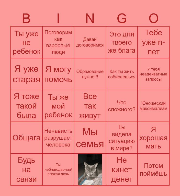 This bingo card has 1 images and 24 words: Общага, Ты неблагодарная/плохая дочь, Все так живут, Не кинет денег, Тебе уже n-лет, Ты уже не ребенок, Поговорим как взрослые люди, Давай договоримся, Что сложного?, Я хорошая мать, Я уже старая, Я могу помочь, Ты видела ситуацию в мире?, У тебя неадекватные запросы, Будь на связи, Ты же мой ребенок, Образование нужно!!!, Как ты жить собираешься, Юношеский максимализм, Я тоже такой была, Ненависть разрушает человека, Мы семья, Это для твоего же блага and Потом поймёшь.