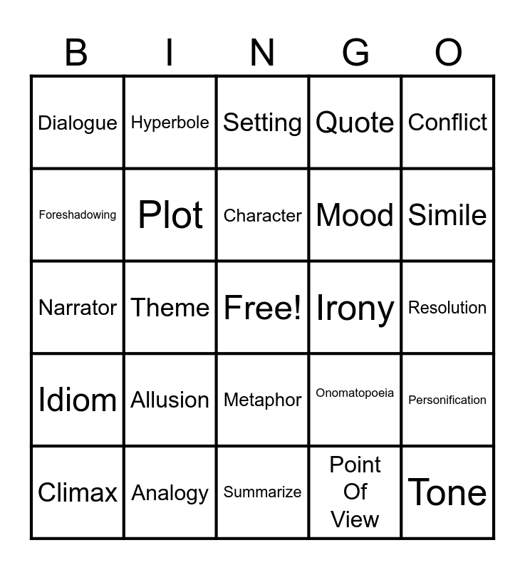This bingo card has a free space and 24 words: Allusion, Analogy, Character, Climax, Conflict, Dialogue, Foreshadowing, Hyperbole, Irony, Metaphor, Mood, Narrator, Onomatopoeia, Personification, Plot, Point Of View, Resolution, Setting, Simile, Theme, Tone, Idiom, Quote and Summarize.