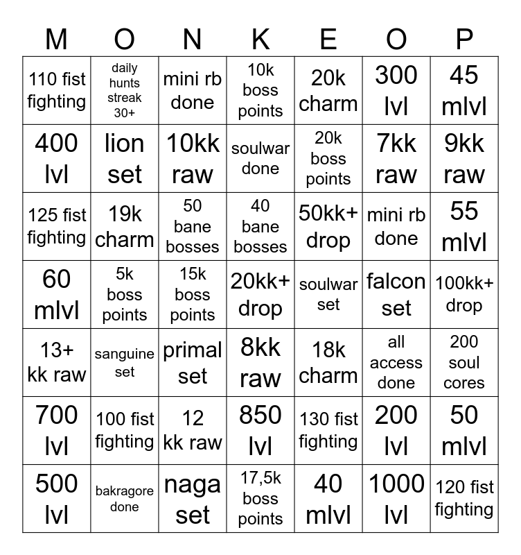 This bingo card has 49 words: 200 lvl, 7kk raw, 40 mlvl, 5k boss points, 50 bane bosses, 100kk+ drop, daily hunts streak 30+, naga set, 300 lvl, 8kk raw, 45 mlvl, 10k boss points, mini rb done, 50kk+ drop, 100 fist fighting, falcon set, 400 lvl, 9kk raw, 50 mlvl, 20k charm, 20k boss points, 15k boss points, 110 fist fighting, lion set, 500 lvl, 10kk raw, 55 mlvl, bakragore done, 40 bane bosses, 19k charm, 120 fist fighting, soulwar set, 700 lvl, 12 kk raw, 60 mlvl, 18k charm, all access done, 200 soul cores, 125 fist fighting, primal set, 850 lvl, 13+ kk raw, 20kk+ drop, 17,5k boss points, soulwar done, mini rb done, 130 fist fighting, sanguine set and 1000 lvl.