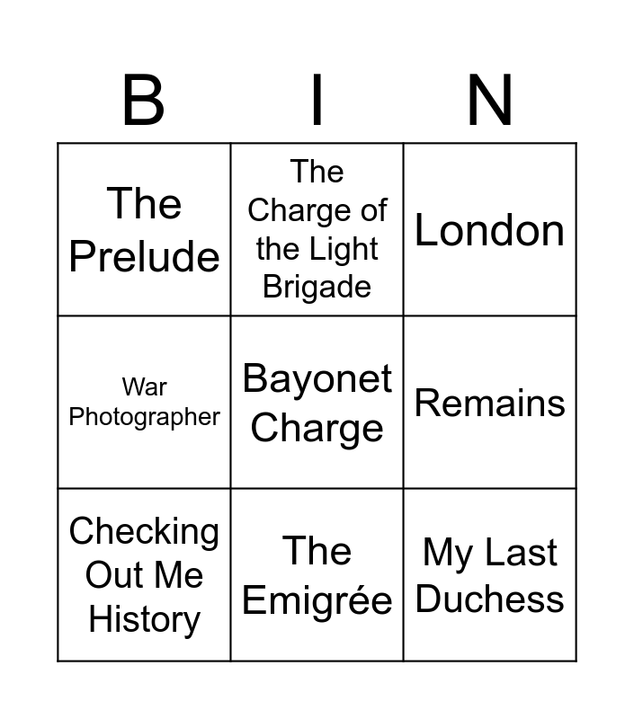 This bingo card has 16 words: Free!, Ozymandias, London, The Prelude, My Last Duchess, The Charge of the Light Brigade, Exposure, Storm on the Island, Bayonet Charge, Remains, Poppies, War Photographer, Tissue, The Emigrée, Checking Out Me History and Kamikaze.