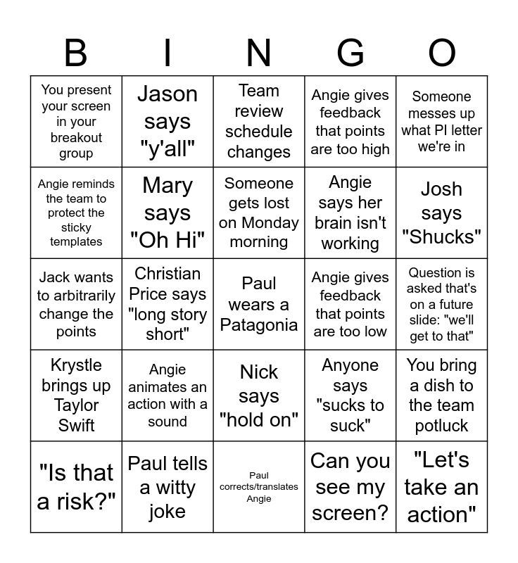 This bingo card has a free space and 45 words: Angie goes takes a smoke break, "Let's take an action", Someone makes fun of Paul's mouse, "Is that a risk?", Planning ends early, Can you see my screen?, Team review schedule changes, Angie calls a sprint a PI, Someone messes up what PI letter we're in, Paul tells a witty joke, Angie gives feedback that points are too high, Angie gives feedback that points are too low, Nick says "hold on", Angie animates an action with a sound, Angie makes up a word, Paul corrects/translates Angie, Carter is looking for Angie, Jack wants to arbitrarily change the points, Kris asks when the NW team is going to meet, Josh says "Shucks", Jason says "y'all", You dress to the theme on Wednesday, Angie reminds the team if there's no charge number don't work it, You present your screen in your breakout group, A stakeholder joins Monday morning kickoff, Question is asked that's on a future slide: "we'll get to that", Krystle runs a menti poll, Adam shows off pictures of his cat, Anyone says "sucks to suck", Krystle brings up Taylor Swift, You go to the Hangar on Thursday, You bring a dish to the team potluck, Someone drastically changed their appearance before PI planning, Someone says a dad joke, Stakeholder induces a scope change, Christian Price says "long story short", Your team wins during mandatory fun, Krystle says "sure do", IT issues in Independence, Someone gets lost on Monday morning, Angie reminds the team to protect the sticky templates, Angie says her brain isn't working, Brandon calls Angie "Miss Angela", Mary says "Oh Hi" and Adam says “oh my God I cannot type right now”.