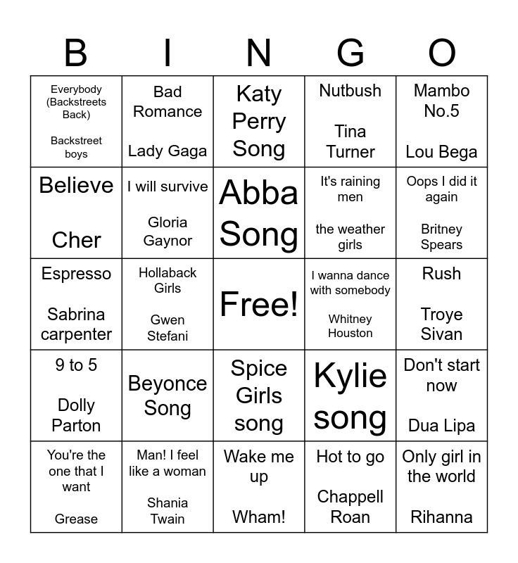 This bingo card has a free space and 24 words: Beyonce Song, Man! I feel like a woman Shania Twain, Abba Song, You're the one that I want Grease, Mambo No.5 Lou Bega, Everybody (Backstreets Back) Backstreet boys, Believe Cher, Bad Romance Lady Gaga, I wanna dance with somebody Whitney Houston, Spice Girls song, It's raining men the weather girls, Espresso Sabrina carpenter, Kylie song, Don't start now Dua Lipa, I will survive Gloria Gaynor, Hot to go Chappell Roan, Rush Troye Sivan, Katy Perry Song, Oops I did it again Britney Spears, Hollaback Girls Gwen Stefani, Only girl in the world Rihanna, 9 to 5 Dolly Parton, Nutbush Tina Turner and Wake me up Wham!.