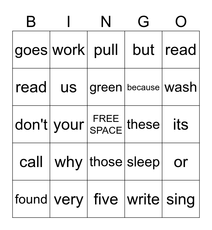 This bingo card has a free space and 29 words: always, very, pull, man, read, goes, us, green, these, or, found, your, write, sing, don't, cold, five, sleep, wash, call, why, wish, because, its, read, work, those, but and which.