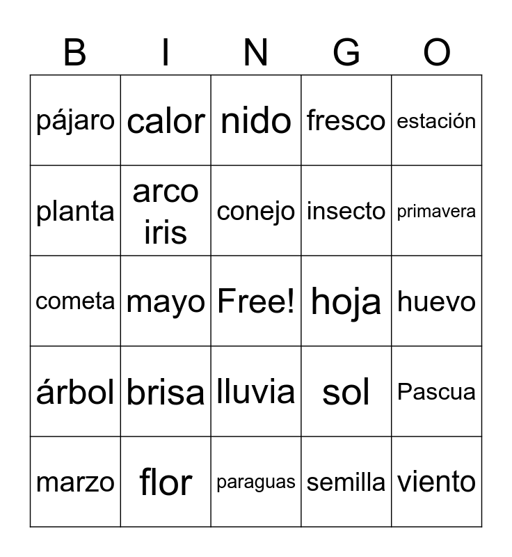 This bingo card has a free space and 29 words: marzo, abril, mayo, nube, pájaro, nido, arco iris, brisa, hoja, flor, huevo, viento, paraguas, semilla, primavera, mariposa, lluvia, árbol, estación, cometa, sol, cielo, insecto, planta, fresco, calor, Pascua, conejo and dulces.
