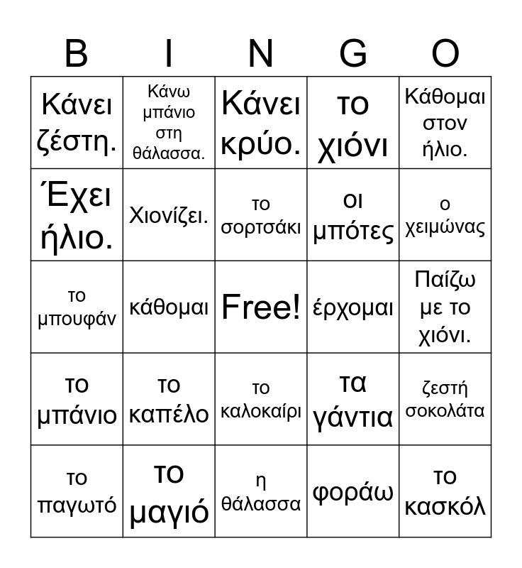This bingo card has a free space and 24 words: το καπέλο, το μαγιό, το σορτσάκι, το παγωτό, Κάθομαι στον ήλιο., Κάνει ζέστη., Έχει ήλιο., Κάνω μπάνιο στη θάλασσα., έρχομαι, το καλοκαίρι, οι μπότες, το μπουφάν, τα γάντια, ζεστή σοκολάτα, Χιονίζει., φοράω, Παίζω με το χιόνι., Κάνει κρύο., ο χειμώνας, κάθομαι, το κασκόλ, το μπάνιο, το χιόνι and η θάλασσα.