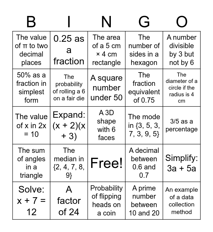 This bingo card has 26 words: Free!, A prime number between 10 and 20, A square number under 50, A factor of 24, A number divisible by 3 but not by 6, The value of π to two decimal places, 50% as a fraction in simplest form, 0.25 as a fraction, 3/5 as a percentage, A decimal between 0.6 and 0.7, The fraction equivalent of 0.75, The value of x in 2x = 10, Simplify: 3a + 5a, Solve: x + 7 = 12, Expand: (x + 2)(x + 3), A term from the sequence: 3, 6, 9, 12…, The number of sides in a hexagon, The sum of angles in a triangle, The area of a 5 cm × 4 cm rectangle, A 3D shape with 6 faces, The diameter of a circle if the radius is 4 cm, Probability of flipping heads on a coin, The mode in {3, 5, 3, 7, 3, 9, 5}, The median in {2, 4, 7, 8, 9}, The probability of rolling a 6 on a fair die and An example of a data collection method.