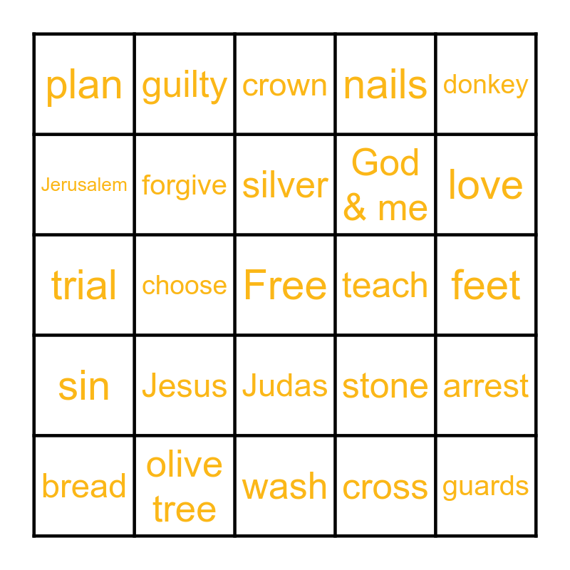 This bingo card has a free space and 34 words: palms, cross, dinner, prays, sin, forgive, donkey, bread, guilty, son of God, silver, crown, tomb, he lives!, teach, love, olive tree, trial, Jesus, stone, Judas, rescue, plan, feet, wash, guards, nails, soldier, God & me, Jerusalem, good right way, choose, arrest and darkness.