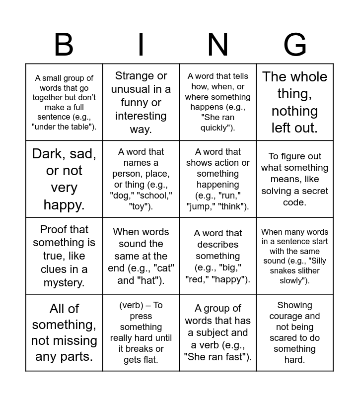 This bingo card has 20 words: When many words in a sentence start with the same sound (e.g., "Silly snakes slither slowly")., A way to compare two things using "like" or "as" (e.g., "as fast as a cheetah")., A word that tells how, when, or where something happens (e.g., "She ran quickly")., Strong and healthy., All of something, not missing any parts., Dark, sad, or not very happy., (verb) – To press something really hard until it breaks or gets flat., A small group of words that go together but don’t make a full sentence (e.g., "under the table")., Proof that something is true, like clues in a mystery., Strange or unusual in a funny or interesting way., When words sound the same at the end (e.g., "cat" and "hat")., A word that describes something (e.g., "big," "red," "happy")., A word that names a person, place, or thing (e.g., "dog," "school," "toy")., Showing courage and not being scared to do something hard., A word that shows action or something happening (e.g., "run," "jump," "think")., Something important or special., To figure out what something means, like solving a secret code., The whole thing, nothing left out., A group of words that has a subject and a verb (e.g., "She ran fast"). and To stay away from something.