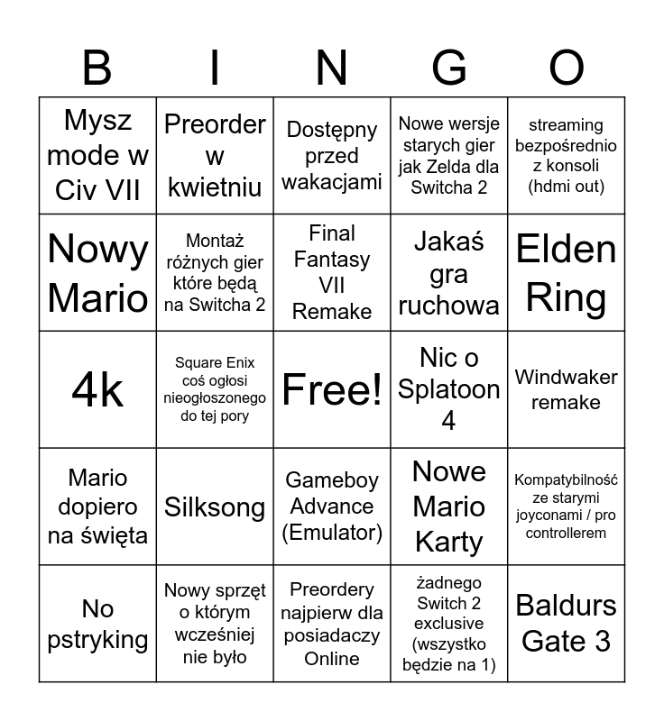This bingo card has a free space and 24 words: Silksong, Nowy sprzęt o którym wcześniej nie było, Final Fantasy VII Remake, No pstryking, streaming bezpośrednio z konsoli (hdmi out), Mysz mode w Civ VII, Nowy Mario, Preorder w kwietniu, Nic o Splatoon 4, Gameboy Advance (Emulator), Jakaś gra ruchowa, 4k, Nowe Mario Karty, Kompatybilność ze starymi joyconami / pro controllerem, Montaż różnych gier które będą na Switcha 2, żadnego Switch 2 exclusive (wszystko będzie na 1), Windwaker remake, Dostępny przed wakacjami, Elden Ring, Square Enix coś ogłosi nieogłoszonego do tej pory, Baldurs Gate 3, Mario dopiero na święta, Nowe wersje starych gier jak Zelda dla Switcha 2 and Preordery najpierw dla posiadaczy Online.