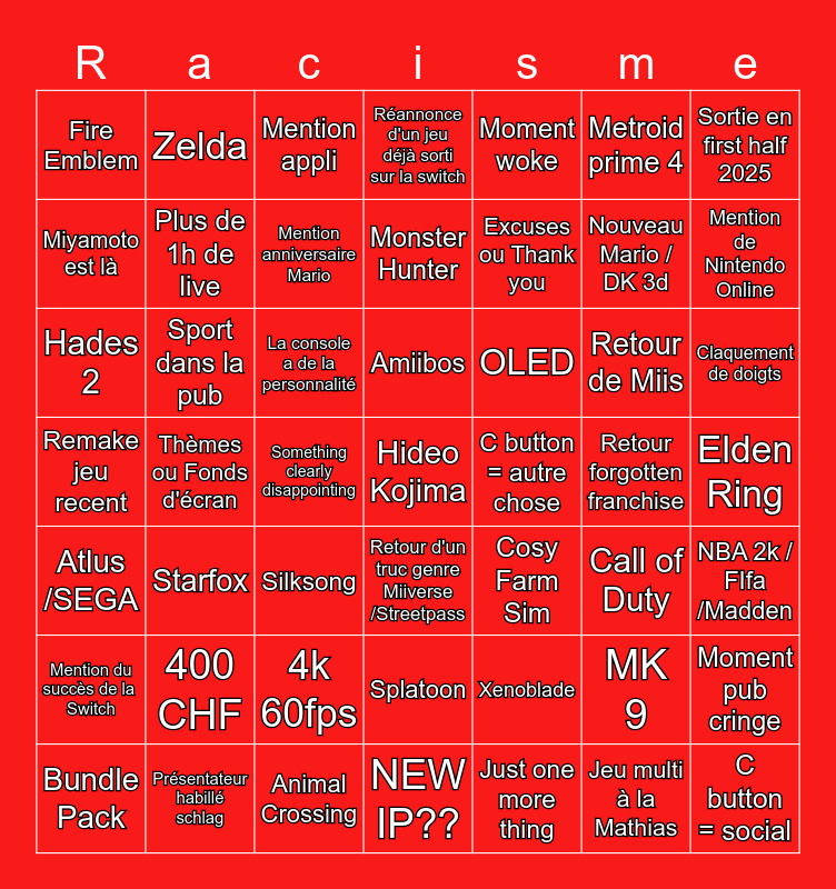 This bingo card has 49 words: MK 9, Nouveau Mario / DK 3d, Just one more thing, Thèmes ou Fonds d'écran, La console a de la personnalité, Elden Ring, Zelda, Animal Crossing, Metroid prime 4, Retour d'un truc genre Miiverse /Streetpass, Sortie en first half 2025, Réannonce d'un jeu déjà sorti sur la switch, Retour de Miis, OLED, 400 CHF, Retour forgotten franchise, Miyamoto est là, Mention de Nintendo Online, Moment pub cringe, Moment woke, Excuses ou Thank you, Something clearly disappointing, Fire Emblem, Plus de 1h de live, Bundle Pack, Mention anniversaire Mario, Claquement de doigts, Présentateur habillé schlag, Amiibos, Sport dans la pub, C button = social, C button = autre chose, Mention du succès de la Switch, 4k 60fps, Remake jeu recent, Cosy Farm Sim, Call of Duty, NBA 2k / FIfa /Madden, Hades 2, Silksong, Splatoon, Atlus /SEGA, Hideo Kojima, NEW IP??, Monster Hunter, Mention appli, Xenoblade, Starfox and Jeu multi à la Mathias.