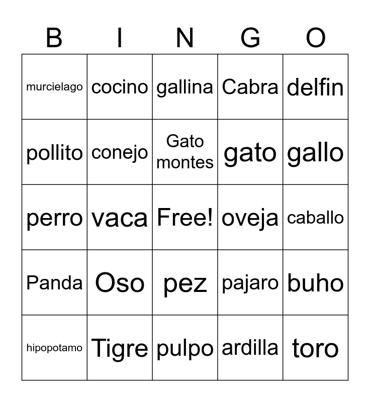 This bingo card has a free space and 24 words: Oso, Tigre, Gato montes, hipopotamo, delfin, murcielago, pollito, cocino, oveja, pez, gato, perro, pajaro, buho, conejo, ardilla, caballo, gallina, gallo, vaca, toro, Panda, Cabra and pulpo.