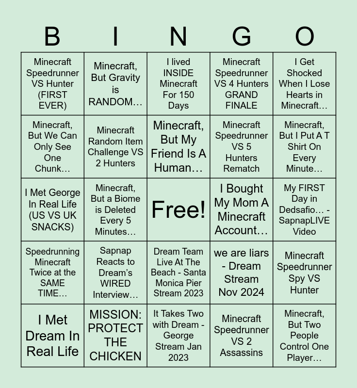 This bingo card has a free space and 59 words: 20 Youtubers VS Titan (In My Real Life House), MISSION: PROTECT THE CHICKEN, Minecraft Hostage Simulator, Speedrunning Minecraft Twice at the SAME TIME…, Minecraft Speedrunner VS 2 Assassins, Minecraft Death Shuffle…, Minecraft Random Item Challenge VS 2 Hunters, Minecraft Speedrunner VS 5 Hunters GRAND FINALE, Minecraft Speedrunner VS 5 Hunters Rematch, Minecraft Speedrunner VS 5 Hunters, Minecraft Speedrunner VS 4 Hunters GRAND FINALE, Minecraft Speedrunner VS 4 Hunters, Minecraft, But We Can Only See One Chunk…, Minecraft Speedrunner VS 3 Hunters GRAND FINALE, Minecraft Block Shuffle, Minecraft Speedrunner VS Hunter (FIRST EVER), Minecraft, But Two People Control One Player…, I Get Shocked When I Lose Hearts in Minecraft…, Minecraft, But We Are Stuck Together…, Minecraft, But My Friend Is A Human…, I Bought My Mom A Minecraft Account…, I lived INSIDE Minecraft For 150 Days, I Met Dream In Real Life, Minecraft Speedrunner Spy VS Hunter, Minecraft, But My Friend Is A Bee…, Minecraft, But Mobs Try And Kidnap My Friends…, Minecraft, But My Friend Is An Axolotl…, Beating Minecraft Before I Freeze…, Minecraft, But I Put A T Shirt On Every Minute…, Minecraft, But My Friend Is A Dog, Minecraft Death Swap 3…, We Need to Beat Minecraft in 15 Minutes, Completing Minecraft Achievements in Real Life, Minecraft Shark VS Fish…, Minecraft, But Gravity is RANDOM…, We Tried The Minecraft COOKBOOK In Real Life…, Minecraft, But I Shrunk My Friends…, Minecraft, But a Biome is Deleted Every 5 Minutes…, Minecraft, But My Friends Are Dirt Blocks…, I Met George In Real Life (US VS UK SNACKS), MCC All-Stars - Sapnap POV, Sapnap Reacts to Dream’s WIRED Interview…, My FIRST Day in Dedsafio… - SapnapLIVE Video, George’s FIRST Victory Royale on OG Fortnite with Sapnap, i am cat - George Stream, MCC All-Stars - George POV, Dream Team’s First Christmas Stream - George Stream, Hot Tubbing With Larray!, Dream Team Live At The Beach - Santa Monica Pier Stream 2023, It Takes Two with Dream - George Stream Jan 2023, Memes with BBH and Skeppy - George Stream Feb 2023, IRL IN SPAIN - George Stream June 2023, Dream Team at Disney! - George Stream Nov 2024, MCC 24 - George POV, Dream FNAF Stream - Jan 2022, we are liars - Dream Stream Nov 2024, MCC 24 - Dream POV, Dream Subathon 1 sub = 1 second - Feb 2022 and Dream Geoguessr Stream (You choose which one!).
