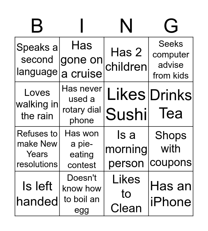 This bingo card has 21 words: Doesn't know how to boil an egg, Likes Spicy Food, Has gone on a cruise, Owns a dog, Likes to Clean, Likes Sushi, Speaks a second language, Has 2 children, Is a morning person, Drinks Tea, Refuses to make New Years resolutions, Seeks computer advise from kids, Has an iPhone, Free!, Has never used a rotary dial phone, Plays the piano, Is left handed, Has won a pie-eating contest, Loves walking in the rain, Shops with coupons and Doesn't like chocolate.