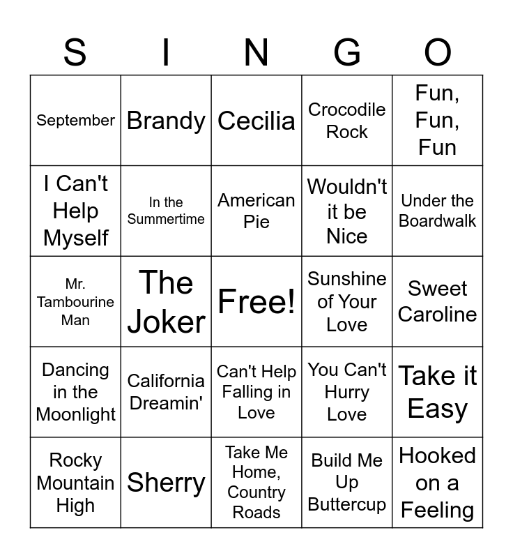 This bingo card has a free space and 34 words: Boogie Shoes, Build Me Up Buttercup, Midnight Train to Georgia, King of the Road, Dancing in the Moonlight, In the Summertime, Fun, Fun, Fun, Rocky Mountain High, Brandy, Brown Eyed Girl, American Pie, Cecilia, Uptown Girl, Kokomo, Sunshine of Your Love, Under the Boardwalk, Sherry, Mr. Tambourine Man, California Dreamin', You Can't Hurry Love, Can't Help Falling in Love, This Will Be, September, Sweet Caroline, Take Me Home, Country Roads, Hooked on a Feeling, Crocodile Rock, You Make My Dreams, Wouldn't it be Nice, I Can't Help Myself, Tiny Dancer, The Joker, Take it Easy and Proud Mary.