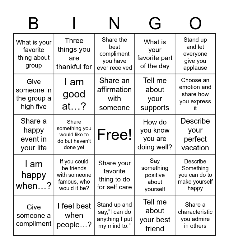 This bingo card has a free space and 24 words: Give someone a compliment, If you could be friends with someone famous, who would it be?, Share an affirmation with someone, Tell me about your best friend, Stand up and let everyone give you applause, What is your favorite thing about group, Three things you are thankful for, Share the best compliment you have ever received, How do you know you are doing well?, Describe your perfect vacation, Share a happy event in your life, I am good at…?, Say something positive about yourself, Describe Something you can do to make yourself happy, Give someone in the group a high five, I feel best when people…?, Stand up and say,”I can do anything I put my mind to.”, What is your favorite part of the day, Choose an emotion and share how you express it, I am happy when…?, Share something you would like to do but haven’t done yet, Share your favorite thing to do for self care, Tell me about your supports and Share a characteristic you admire in others.
