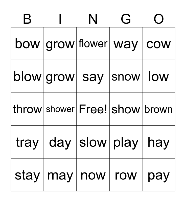 This bingo card has a free space and 24 words: day, may, say, stay, cow, bow, blow, grow, show, slow, snow, throw, play, hay, grow, row, brown, flower, low, shower, pay, tray, way and now.