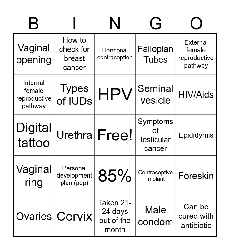 This bingo card has a free space and 24 words: Personal development plan (pdp), Cervix, HPV, Ovaries, External female reproductive pathway, Vaginal opening, Internal female reproductive pathway, How to check for breast cancer, Symptoms of testicular cancer, 85%, Seminal vesicle, Digital tattoo, Contraceptive Implant, Foreskin, Types of IUDs, Male condom, Epididymis, Hormonal contraception, HIV/Aids, Urethra, Can be cured with antibiotic, Vaginal ring, Fallopian Tubes and Taken 21-24 days out of the month.
