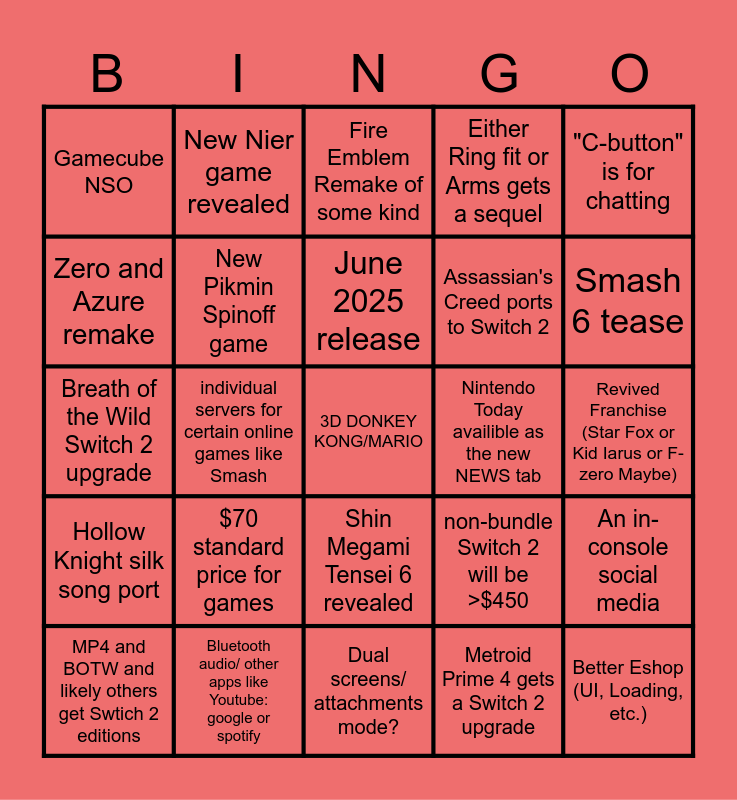 This bingo card has 36 words: Joy-con Mouse controls, Original Switch 2 (standard issue) =OLED, Persona 6, New Pikmin Spinoff game, non-bundle Switch 2 will be >$450, Hollow Knight silk song port, June 2025 release, Monster Hunter and Halo ports, "C-button" is for chatting, More "Nintendo like" UI and THEMES, individual servers for certain online games like Smash, Either Ring fit or Arms gets a sequel, It Isn't called Mariokart 9, Nintendo Today availible as the new NEWS tab, Smash 6 tease, Gamecube NSO, Better Eshop (UI, Loading, etc.), $70 standard price for games, 3D DONKEY KONG/MARIO, Fire Emblem Remake of some kind, Revived Franchise (Star Fox or Kid Iarus or F-zero Maybe), An in-console social media, Bluetooth audio/ other apps like Youtube: google or spotify, MP4 and BOTW and likely others get Swtich 2 editions, Dual screens/ attachments mode?, New Nier game revealed, Breath of the Wild Switch 2 upgrade, Prince of Persia new game, Assassian's Creed ports to Switch 2, Zero and Azure remake, Battlefield game Switch2 port, Monster Hunter Wilds Switch 2 ports, Metroid Prime 4 gets a Switch 2 upgrade, Shin Megami Tensei 6 revealed, Switch 2 priced at 450 USD and Tokyo Mirage Sessions 2.