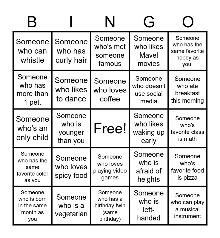 This bingo card has a free space and 24 words: Someone who loves spicy food, Someone who is a vegetarian, Someone who loves coffee, Someone who is born in the same month as you, Someone who has the same favorite hobby as you!, Someone who can whistle, Someone who has more than 1 pet., Someone who has curly hair, Someone who likes waking up early, Someone who loves playing video games, Someone who doesn't use social media, Someone who's an only child, Someone who is afraid of heights, Someone who's favorite food is pizza, Someone who likes to dance, Someone who is left-handed, Someone who's favorite class is math, Someone who's met someone famous, Someone who ate breakfast this morning, Someone who is younger than you, Someone who can play a musical instrument, Someone who has the same favorite color as you, Someone who likes Mavel movies and Someone who has a birthday twin (same birthday).