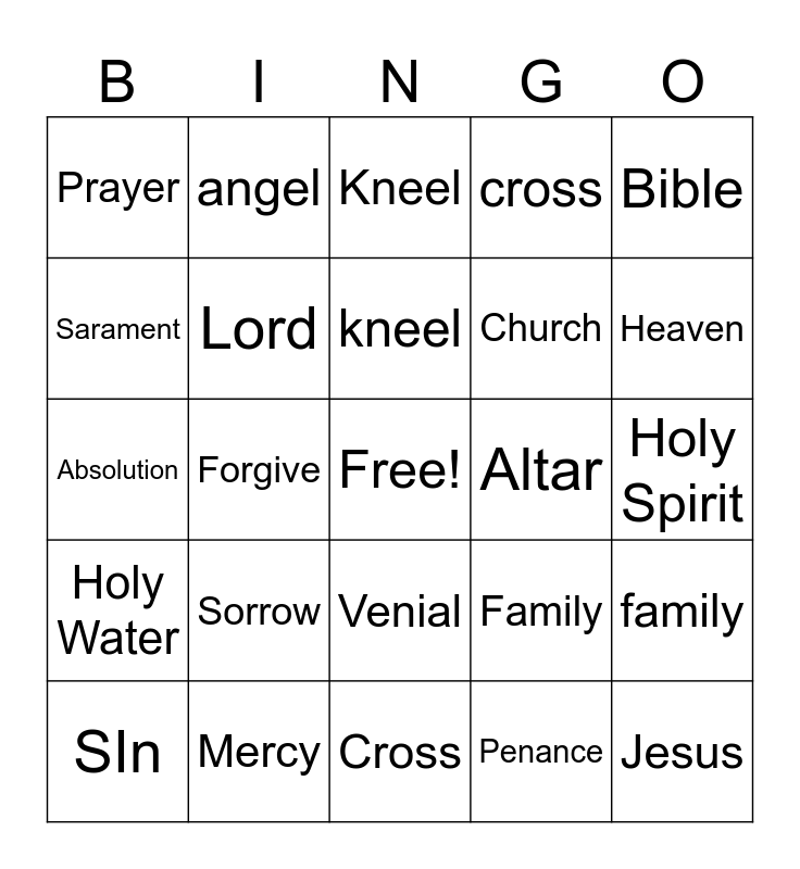 This bingo card has a free space and 29 words: SIn, Priest, Forgive, Pew, Prayer, Kneel, Lord, Sorrow, Altar, Mercy, Holy Spirit, Jesus, Cross, Penance, Heaven, Mortal, Venial, Holy Water, Bible, Absolution, Family, Love, Church, Sarament, cross, angel, family, kneel and heaven.