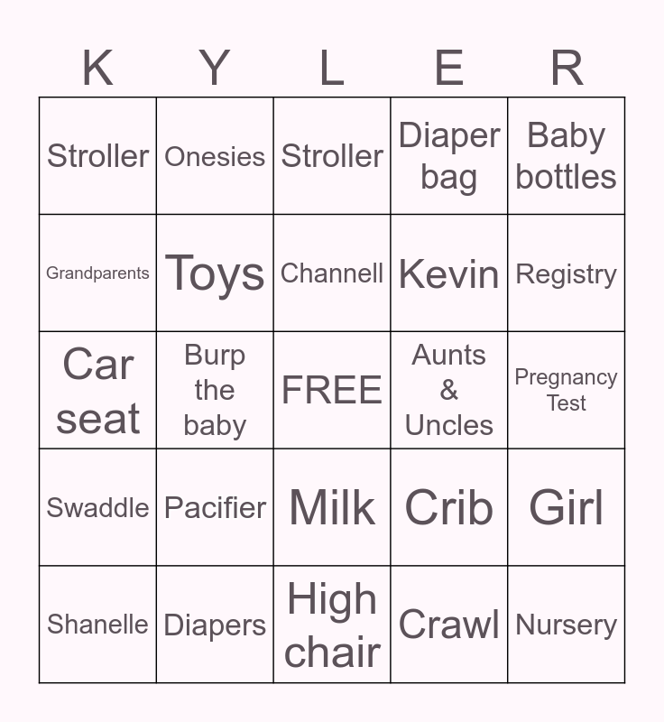 This bingo card has a free space and 24 words: Pacifier, Diapers, Channell, Shanelle, Baby bottles, Stroller, Grandparents, Onesies, Aunts & Uncles, Milk, Kevin, Car seat, Crib, Girl, Toys, Crawl, Pregnancy Test, Stroller, Registry, Burp the baby, Nursery, Swaddle, Diaper bag and High chair.